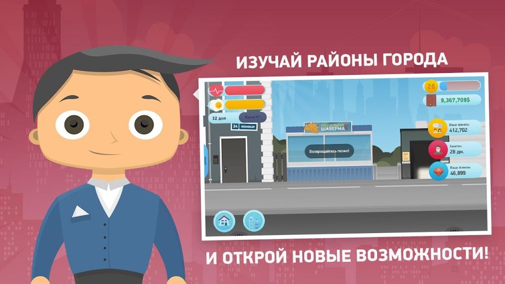 Если изначально вы будете заниматься мелкими делишками, то прокачивая свойства героя, сможете знакомиться с полезными людьми и даже нанимать рабочих в свою маленькую, но дружную компанию. Занимайтесь любимым делом, расширяйте горизонты своего бизнеса, узнавайте, чем вы можете быть полезны, и в какой нише вас ждет успех.