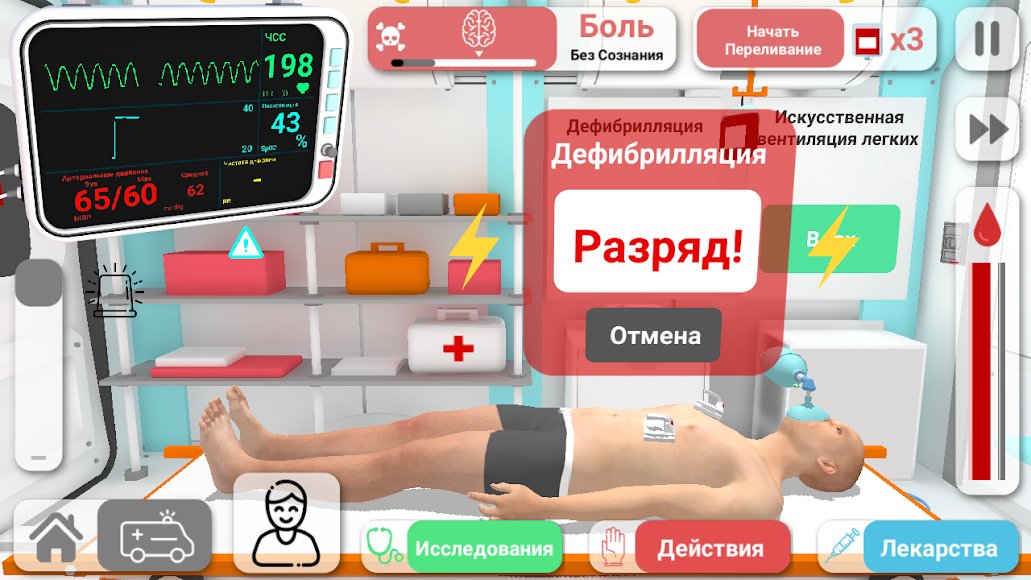 Во время прохождения, пользователь столкнется с различными ситуациями, требующими неотложных действий. Здесь нужно быстро и правильно диагностировать заболевание: инсульты, инфаркты, кровотечения. Всего разработано два десятка уникальных ситуаций, которые научат не только правильно выявить проблему. Также вы будете пытаться оказать правильную помощь, работать с дефибрилляторами, узнаете, какие нужно применять препараты и делать массаж сердца для его запуска. Помимо всего, здесь есть различные апгрейды и возможность проходить курсы для повышения квалификации.